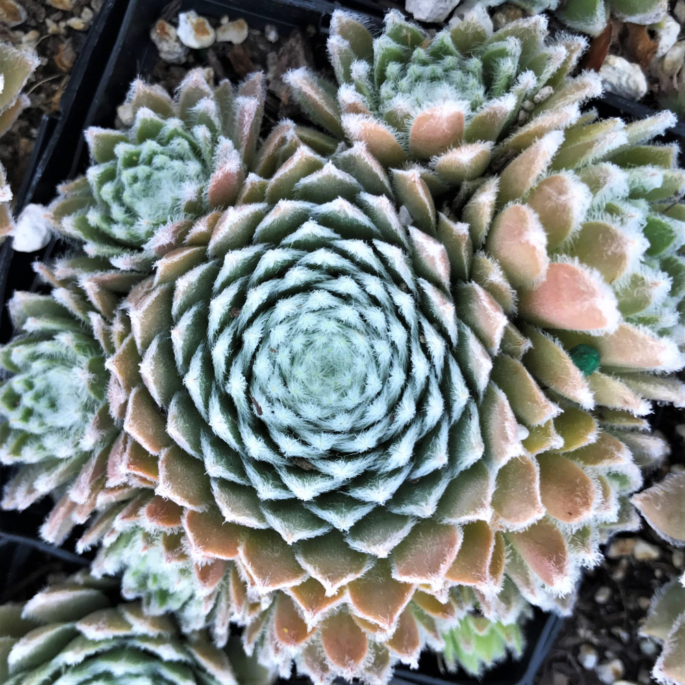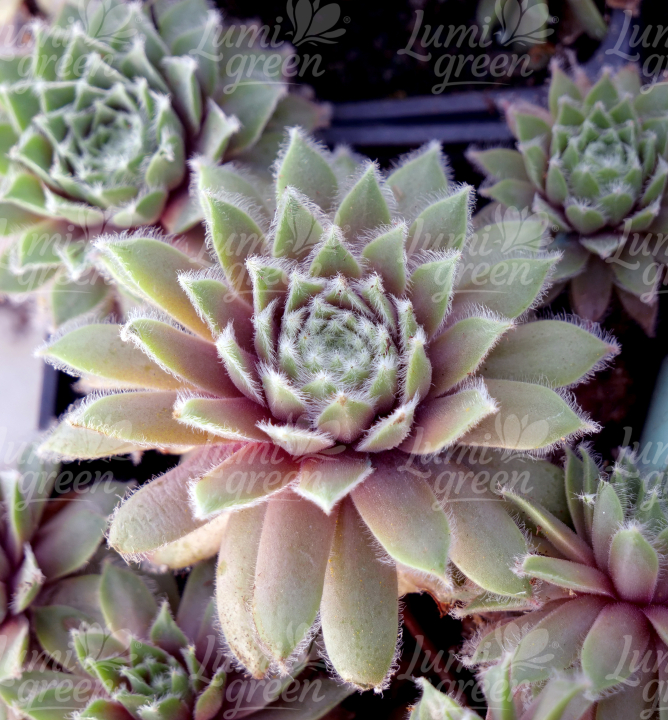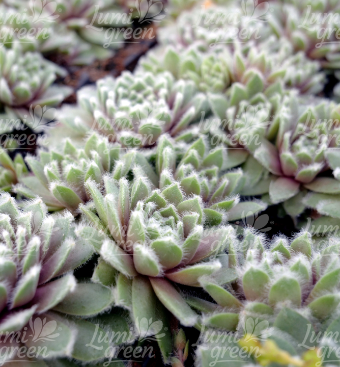 Neobvyklý netřesk se šedo-růžovými masitými listy a bílými chloupky.