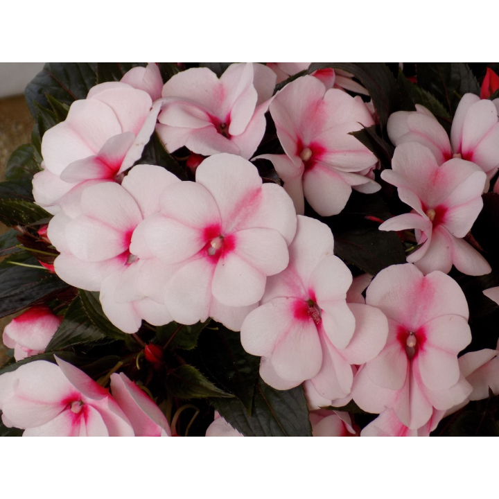 Bohatě kvetoucí netýkavka s éterickými světle růžovými květy s výrazným zbarvením.