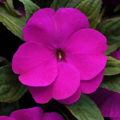 Překrásná netýkavka s výraznými purpurovými květy a tmavě zelenými listy.