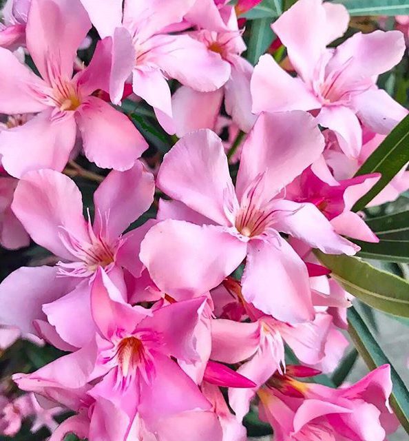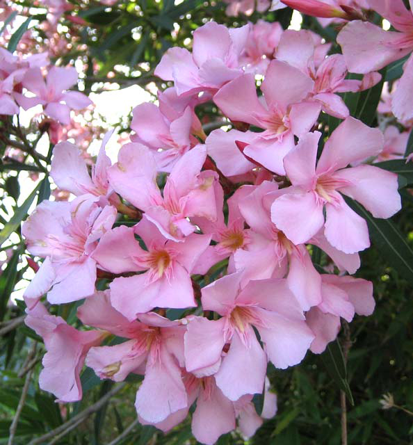 Vyhledávaný oleandr s romantickými bledě růžovými květy.