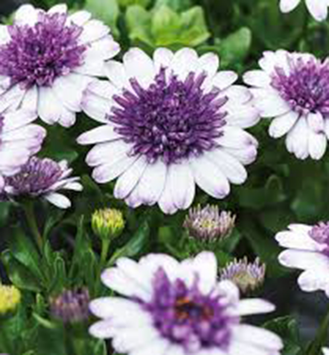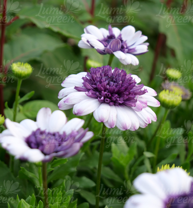 Charakteristika: Osteospermum ´3D BLUEBERRY SHAKE´ kvete během sezóny krásnými plnými květy. Jemná bílá barva se zbarvuje do světle fialových odstínů. Nepřehlédnutelný střed květu je vyplněn kontrastními fialovými okvětními lístky. Listy jsou lesklé, mají tmavě zelenou barvu a nepravidelný okraj.
