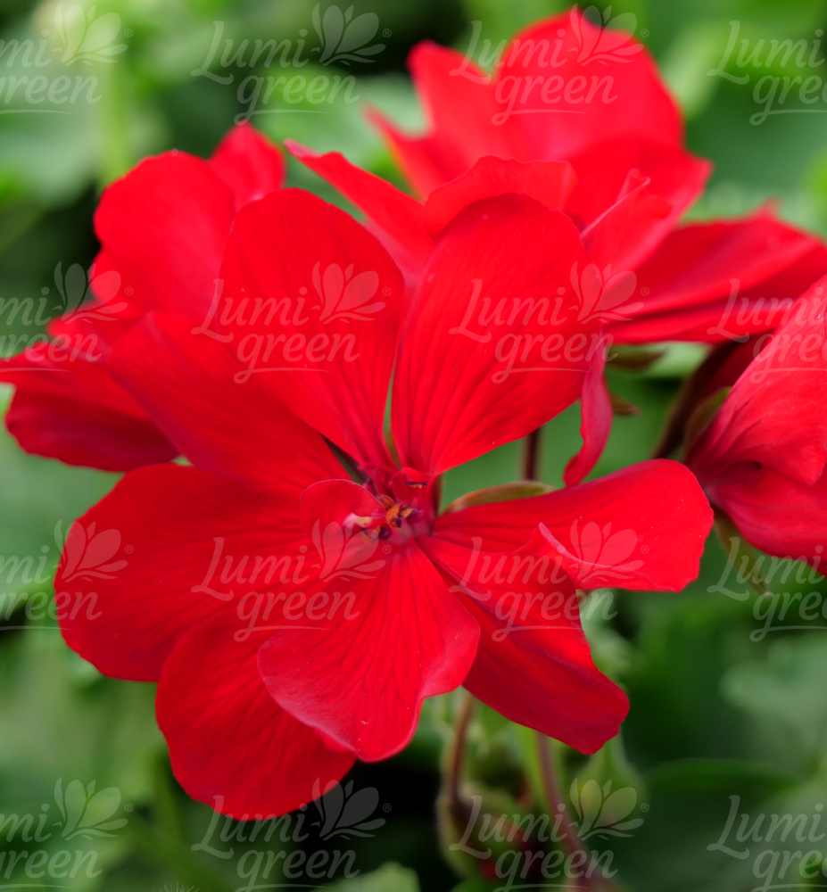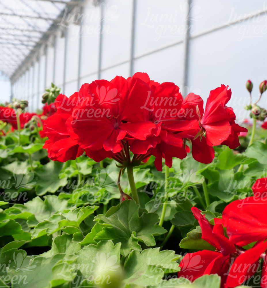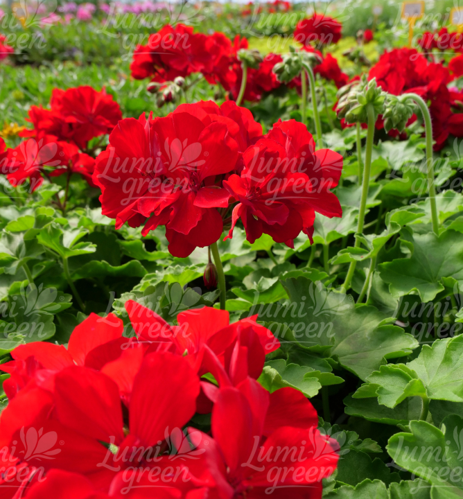 Mezidruhová pelargonie s kompaktním růstem a tmavě červenými květy.