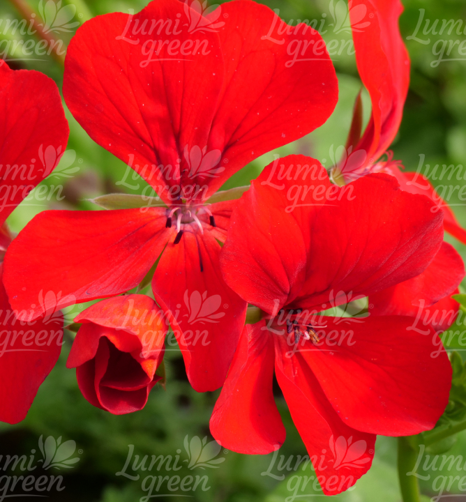 Bohatě kvetoucí pelargonie s množstvím zářivých červených květů.