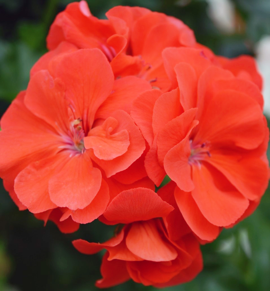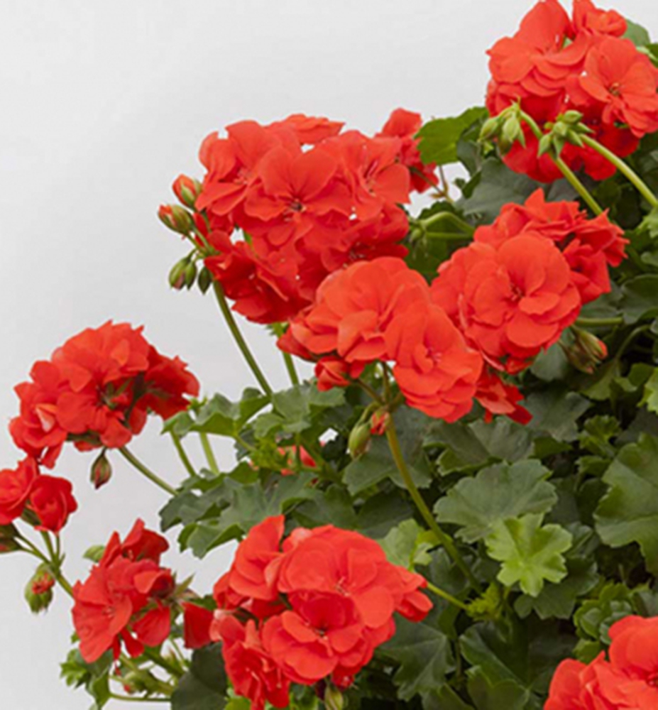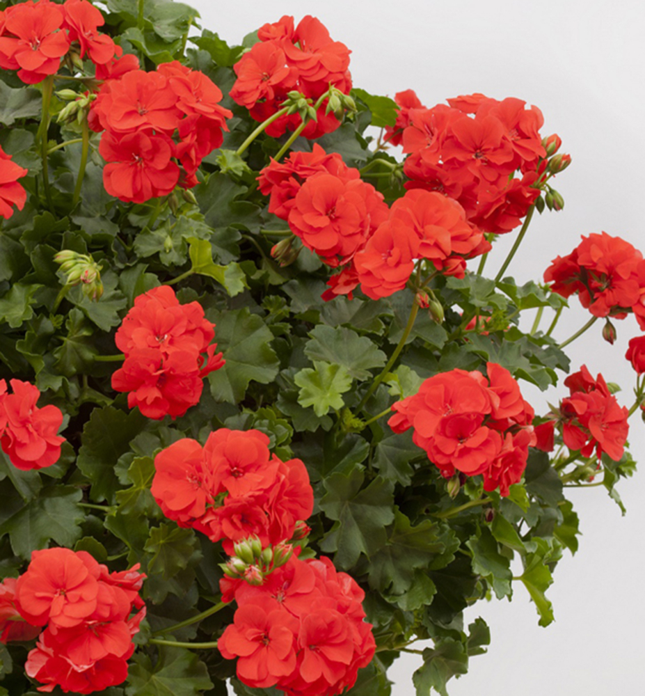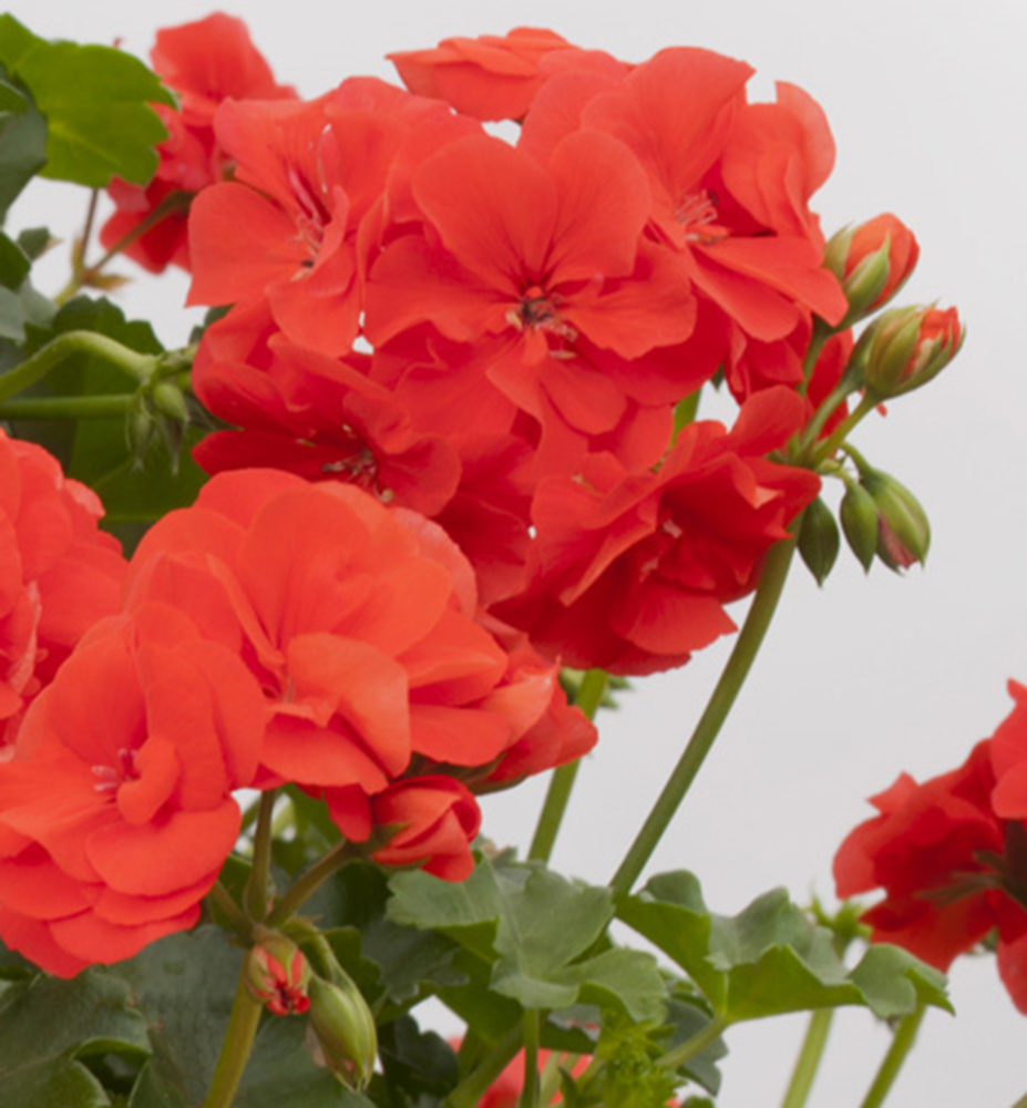 Bohatě kvetoucí plnokvětá pelargónie s výraznými šarlatově červenými květy.