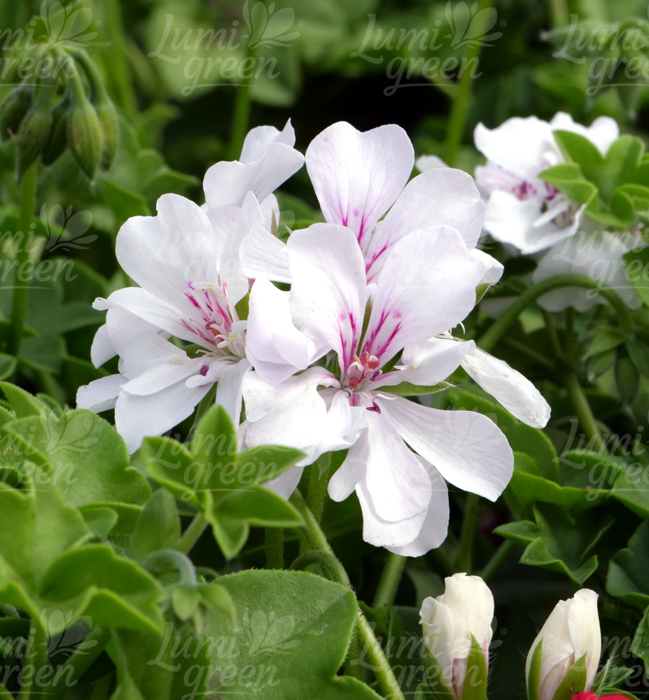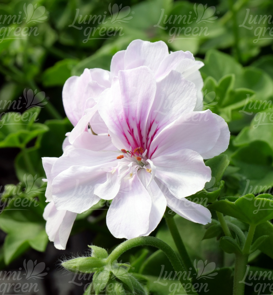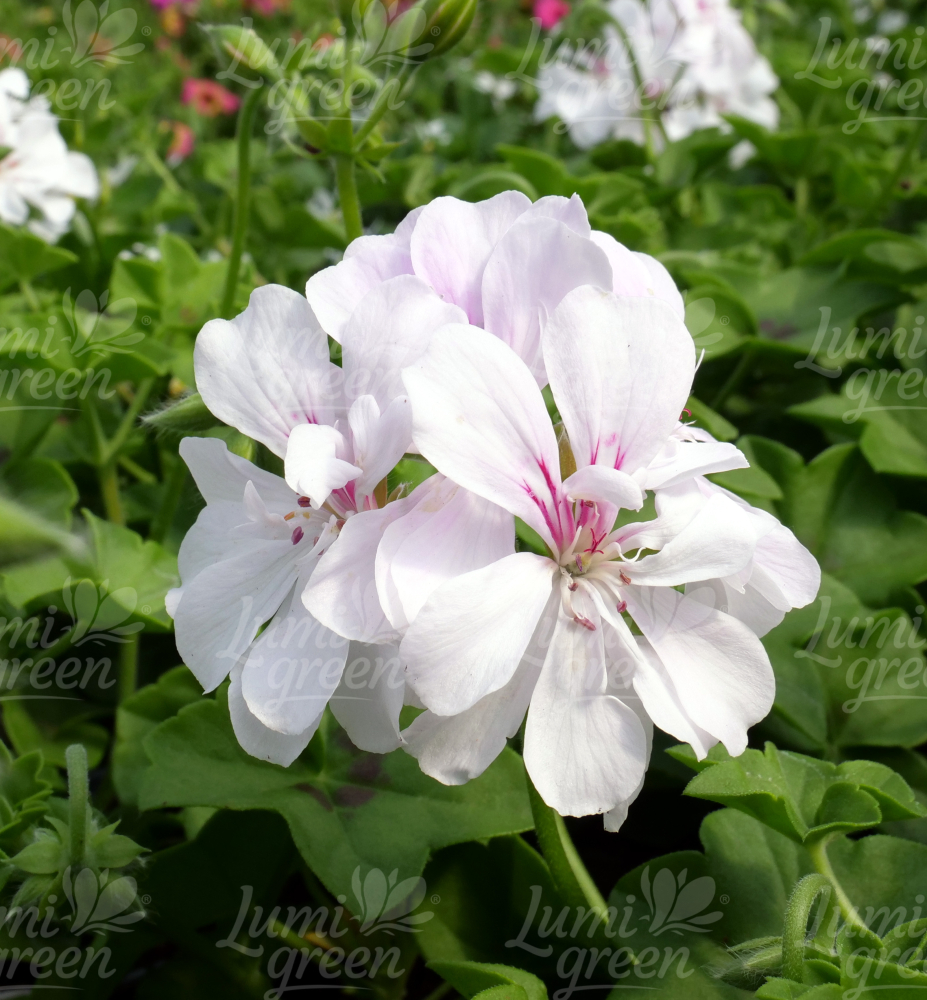 Převislá pelargonie s okouzlujícími poloplnými květy a růžovými tyčinkami.