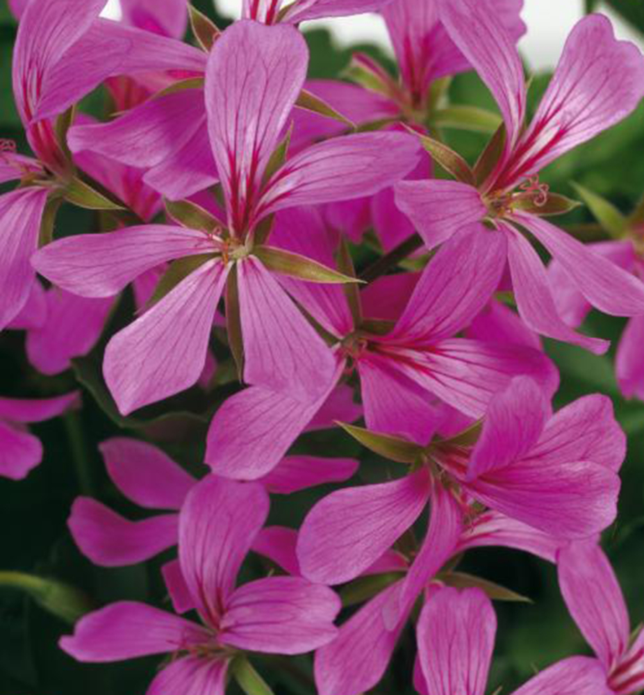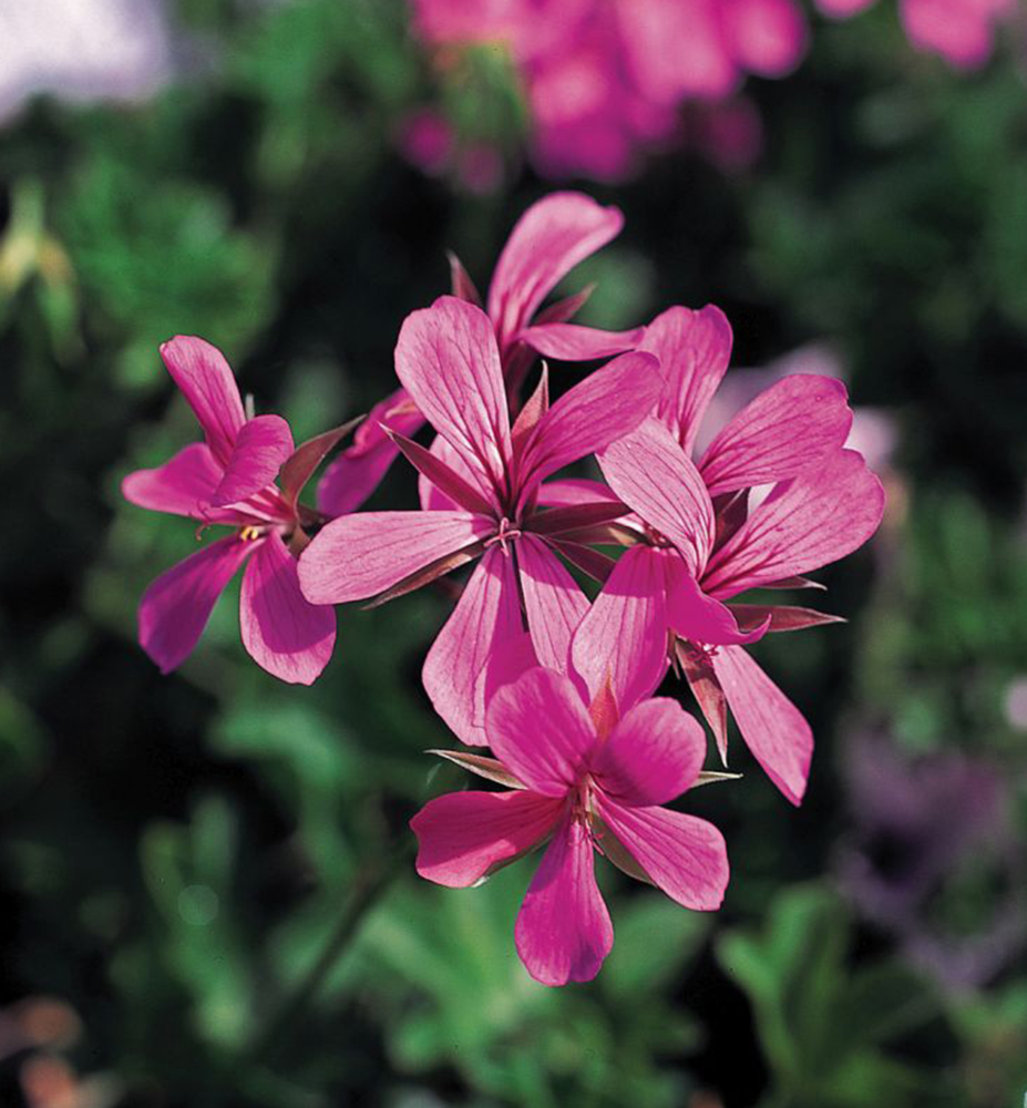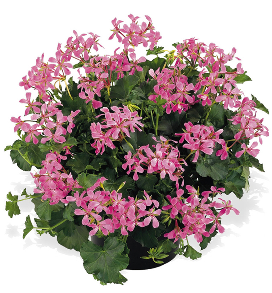 Oblíbená převislá pelargónie s jednoduchými růžově fialovými květy.