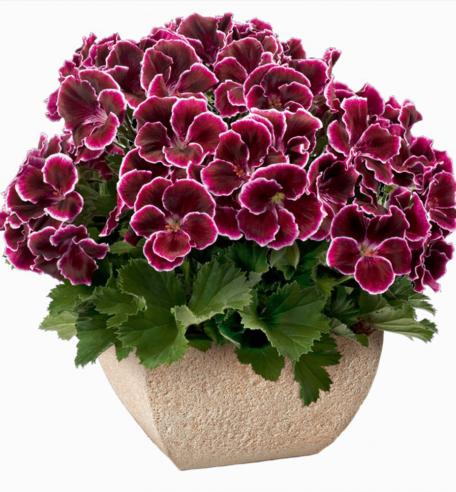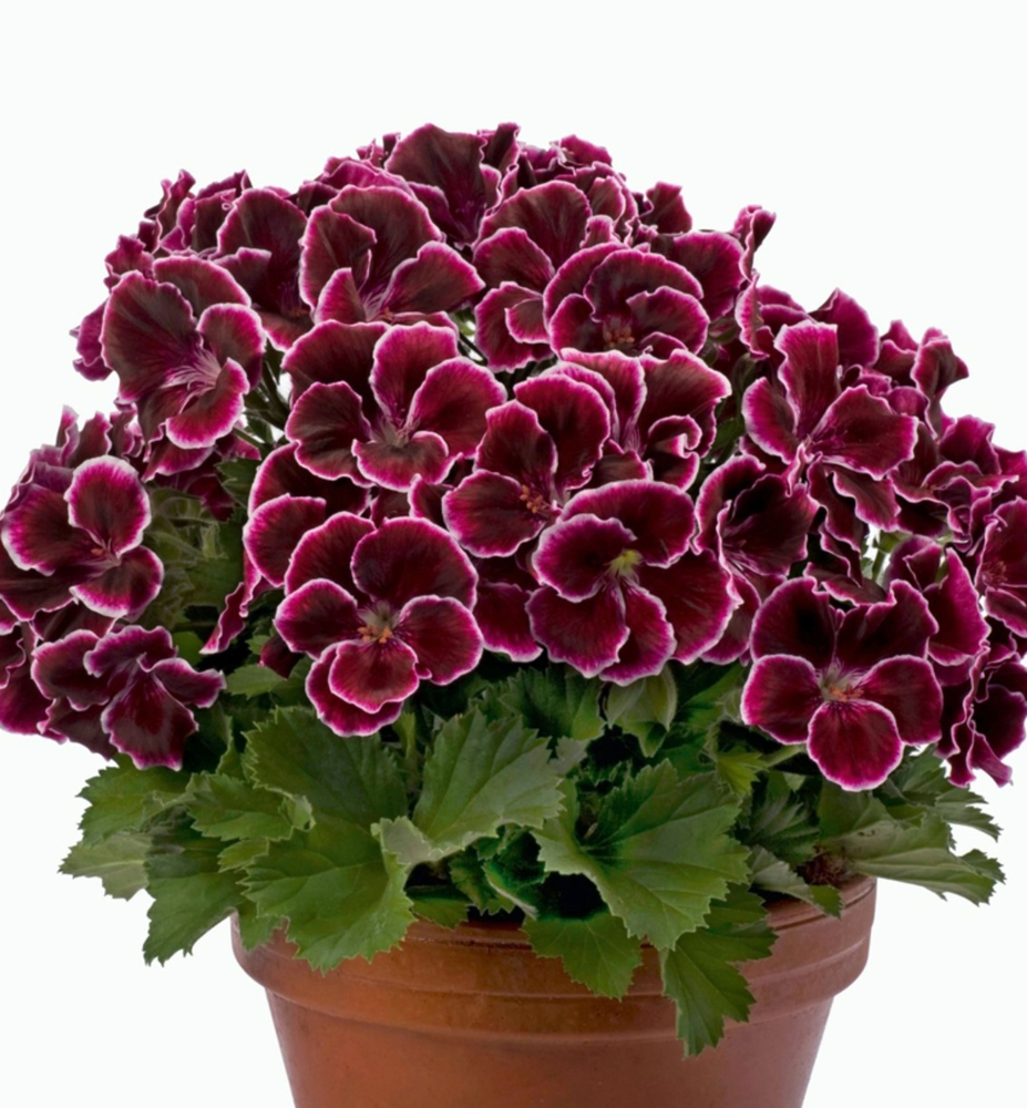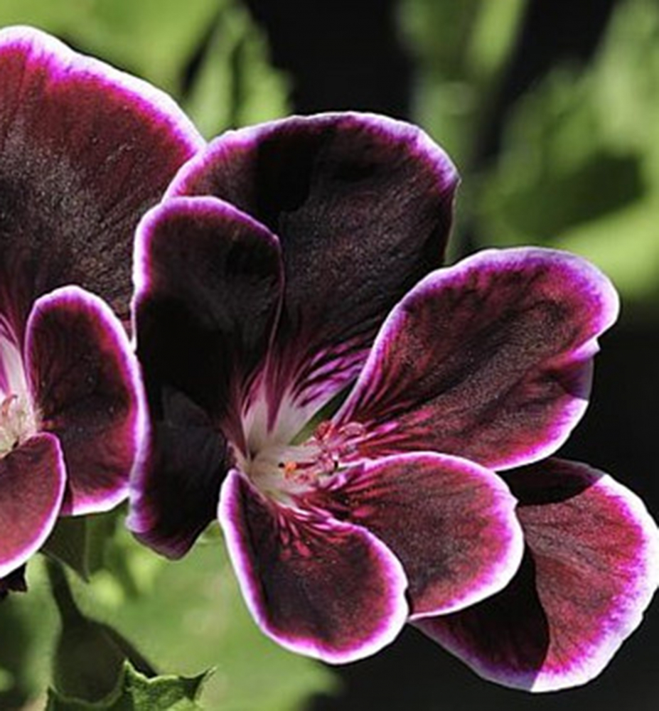 Exkluzivní velkokvětá pelargónie se sametovými květy s bílým okrajem.