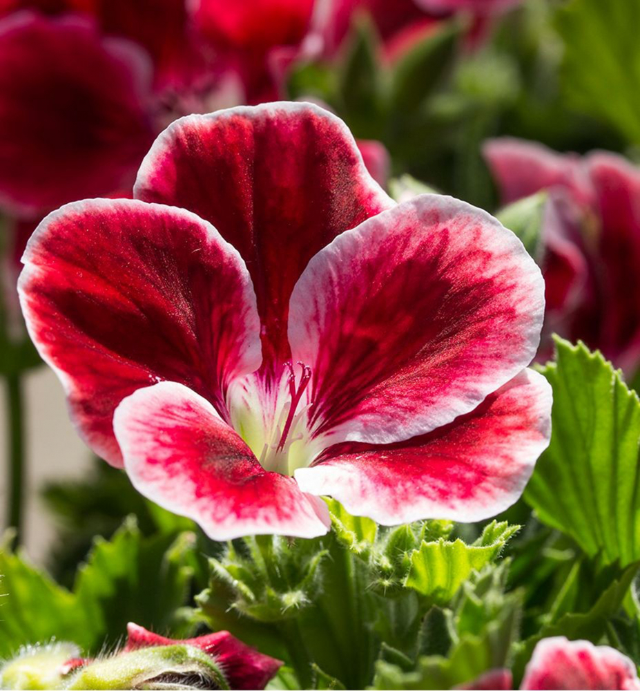 Překrásná pelargonievs výraznými červenými květy s bílým lemem.