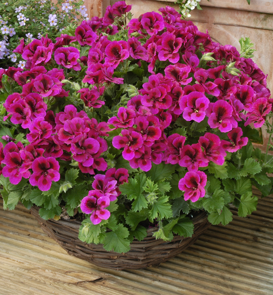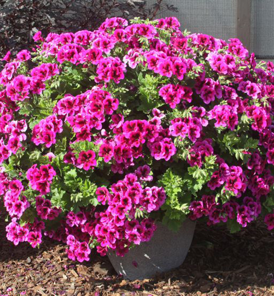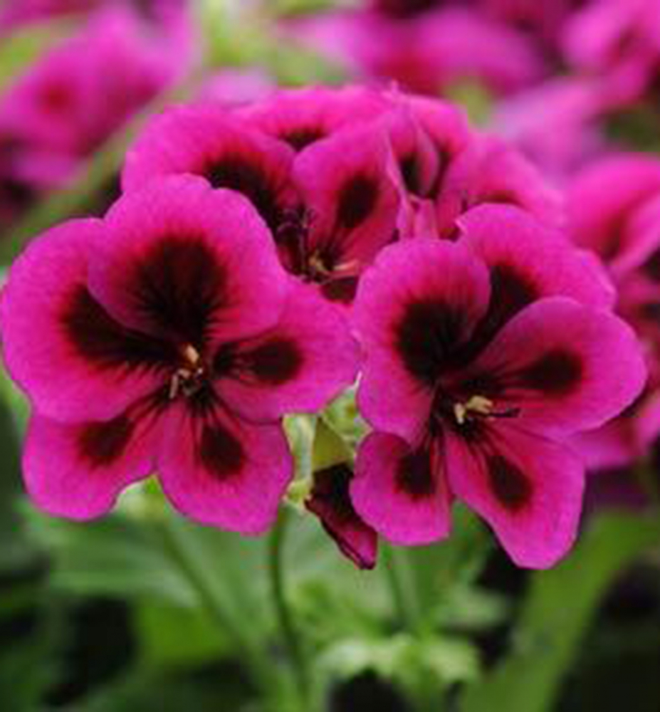 Bohatě kvetoucí pelargonie s velkými fialovými květy s tmavým očkem.
