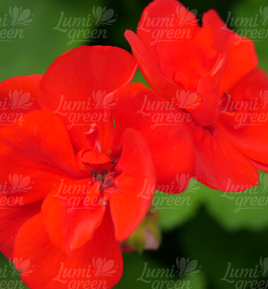 Bohatě kvetoucí pelargonie s poloplnými květy výrazné šarlatové barvy.