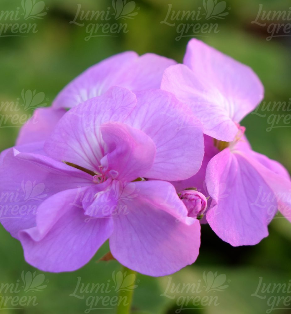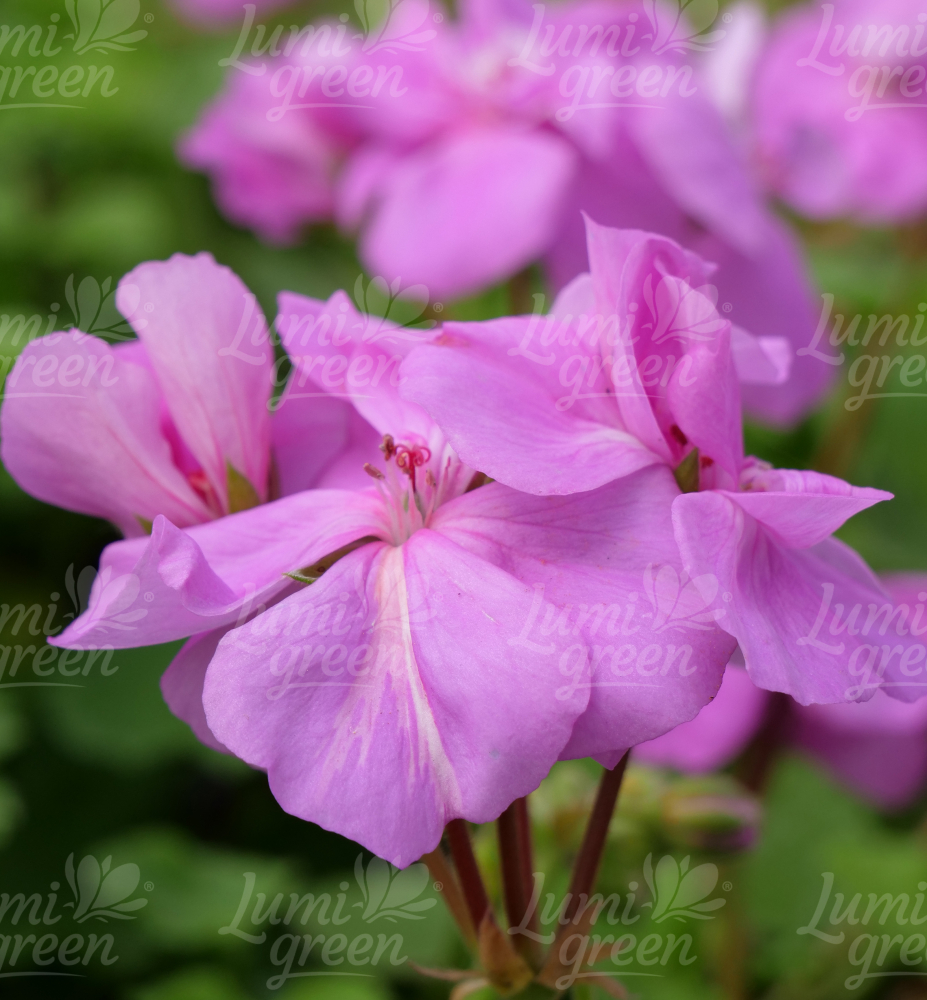 Nová elegantní pelargónie s velkými levandulovými květy a bílým středem.