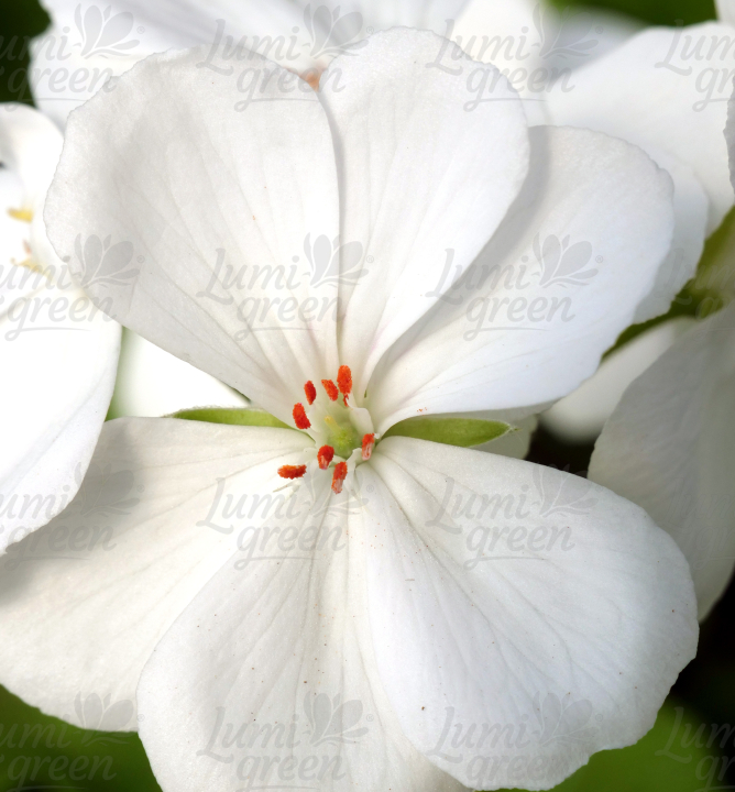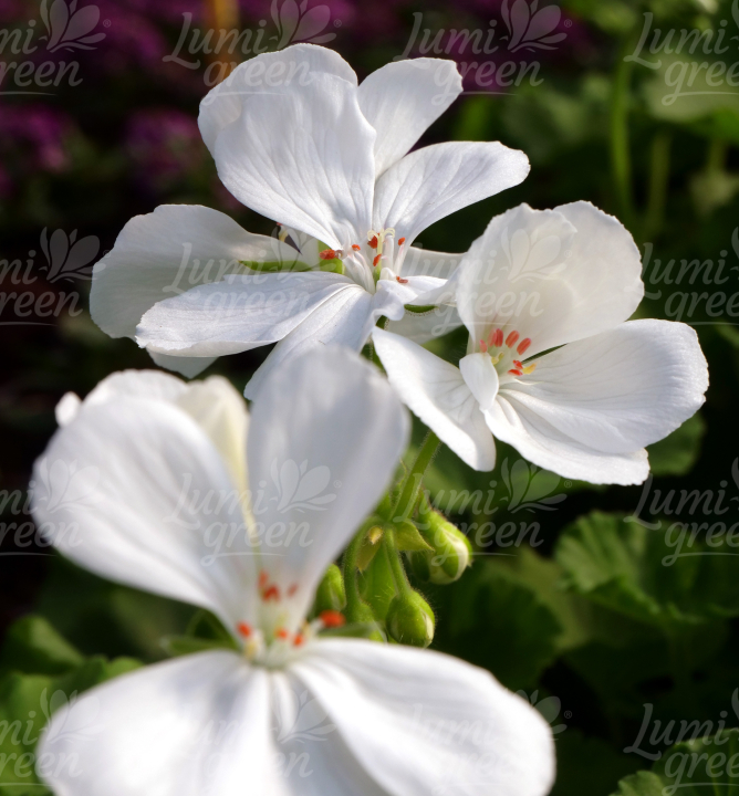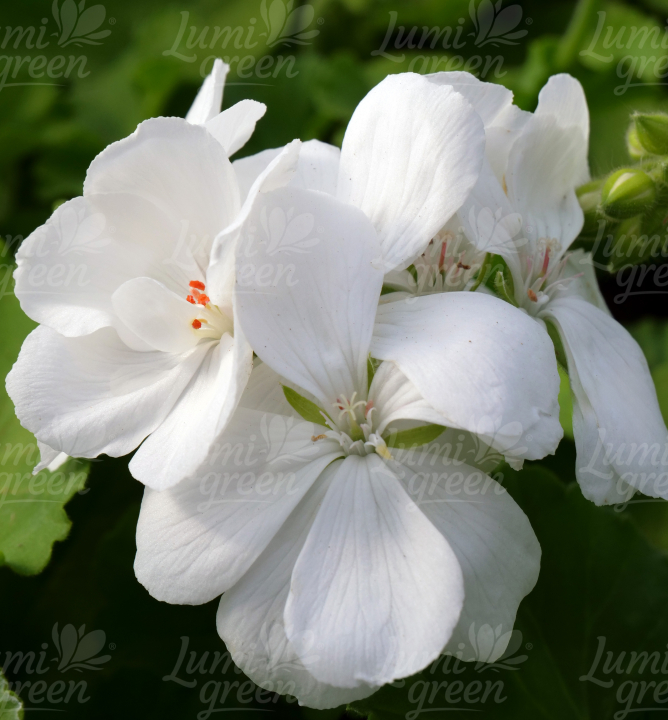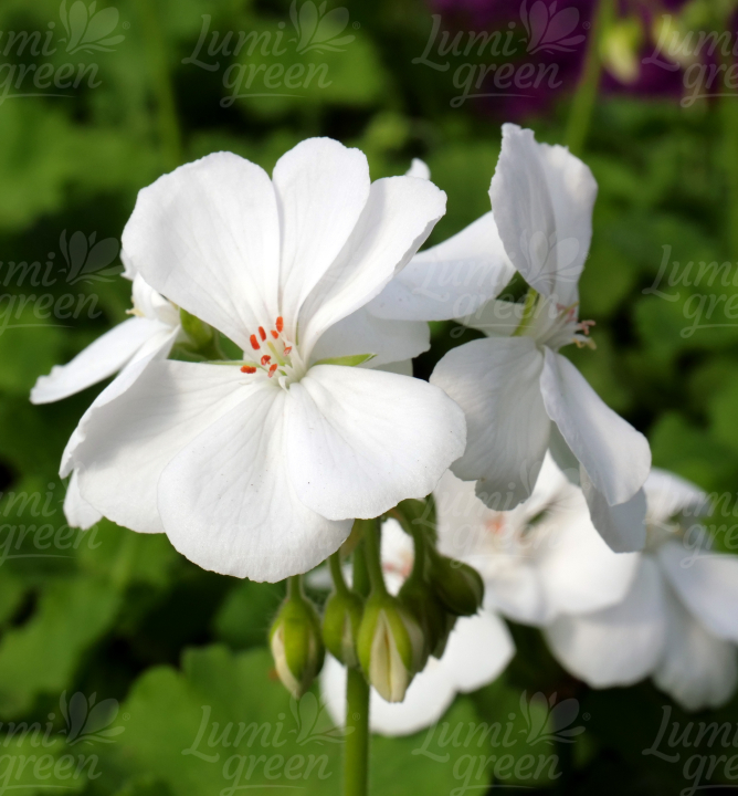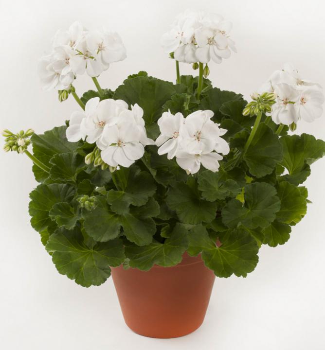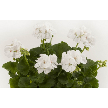 Skoro kvetoucí vzpřímená pelargónie s krásnými sněhobílými květy.