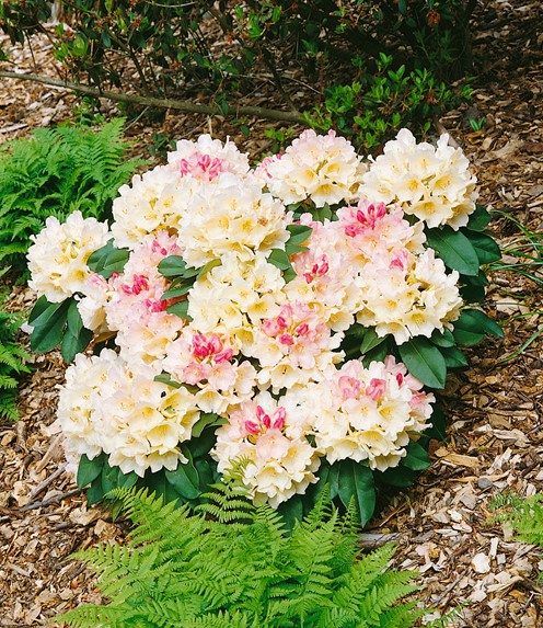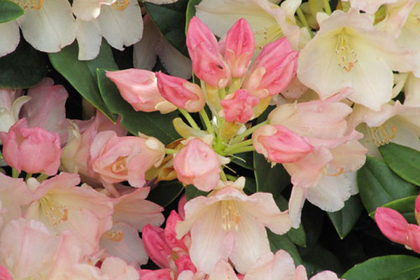 Nádherný bohatě kvetoucí pěnišník v jemných růžových a žlutých odstínech.