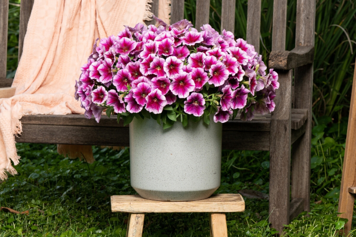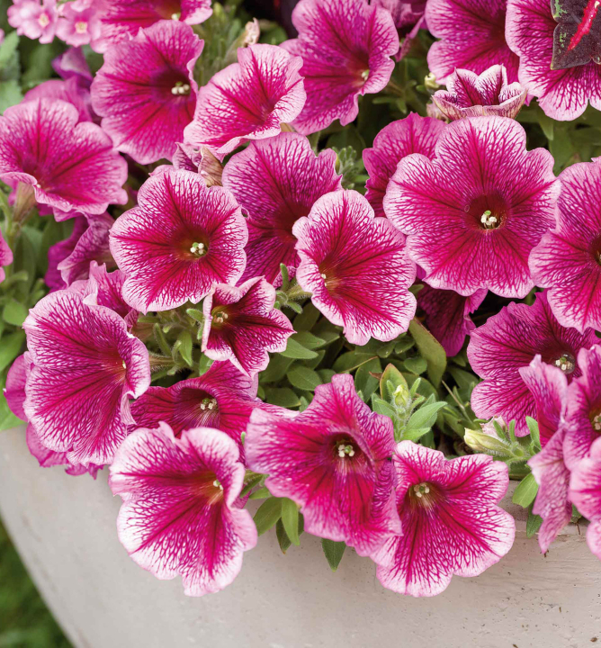 Polopřevislá petunie s fuchsiovorůžovými květy, vhodná do letničkových mixů.