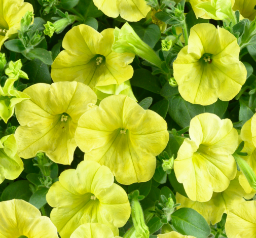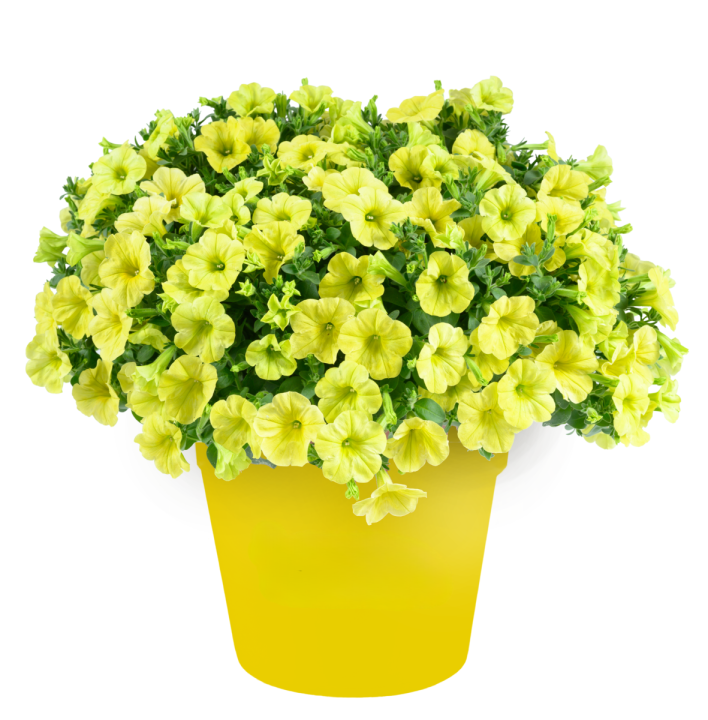 Zářivě žlutá polopřevislá petunie s bohatým kvetením a kompaktním růstem.