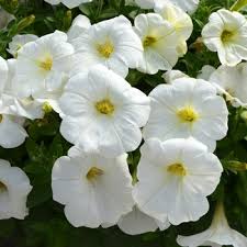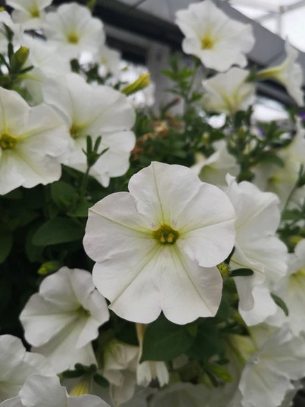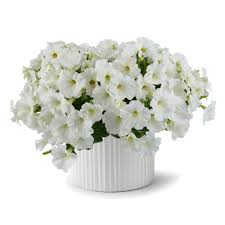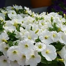 Krásná bílá poloprevisnutá petúnie vhodná do různých barevných kombinací.