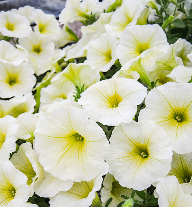Moderní polopřevislá petunie s citrónově žlutými květy.