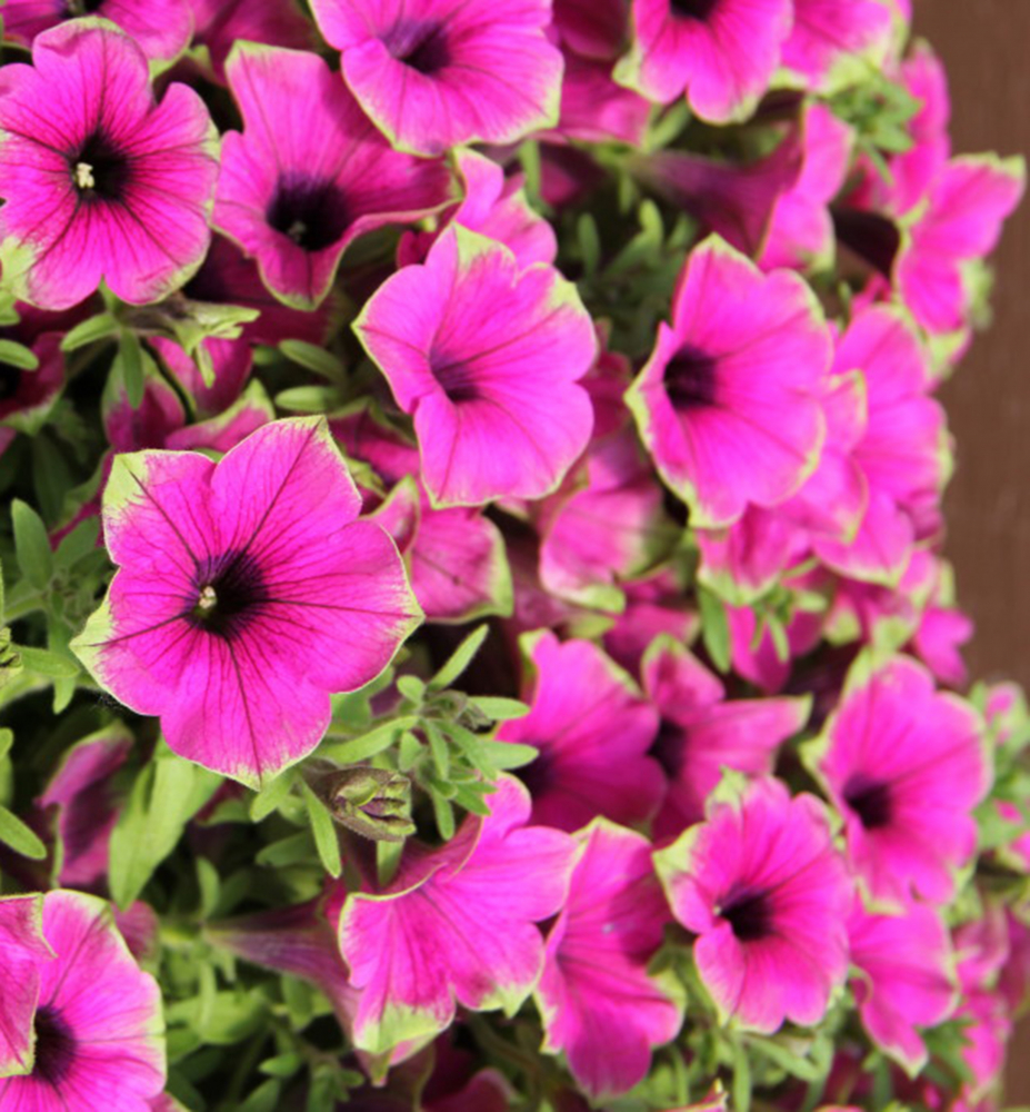 Nádherná velkokvětá petúnie tvořící převisy zářivých růžových květů.