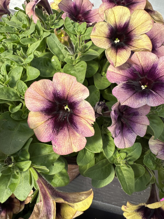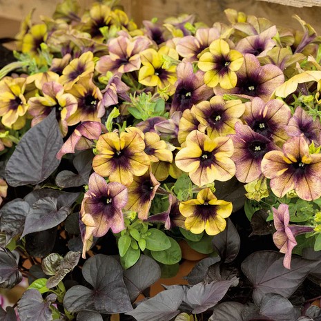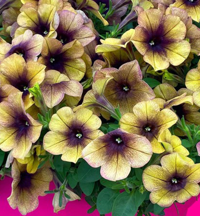 Převislá petunie s květy nesoucími se ve žluto-bronzových odstínech.