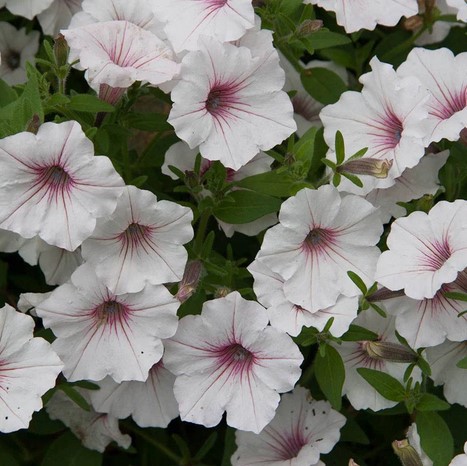 Bohatě kvetoucí petunie s bílými květy s kontrastní růžovou kresbou.