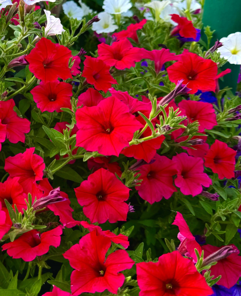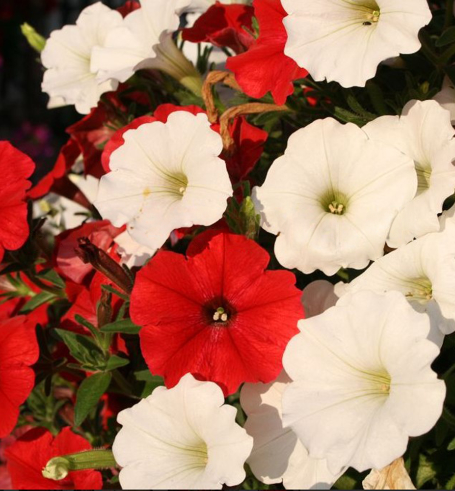 Sytě červená polopřevislá petunie s bohatým a dlouhotrvajícím kvetením.