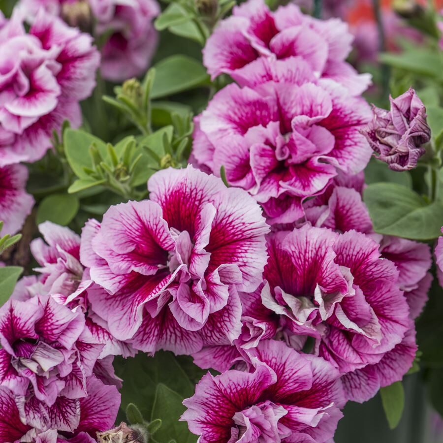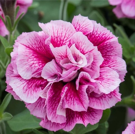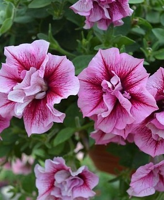 Romanticky působící plnokvětá petunie s růžovými květy a tmavší kresbou.
