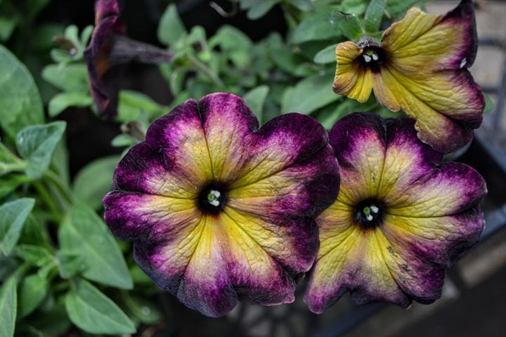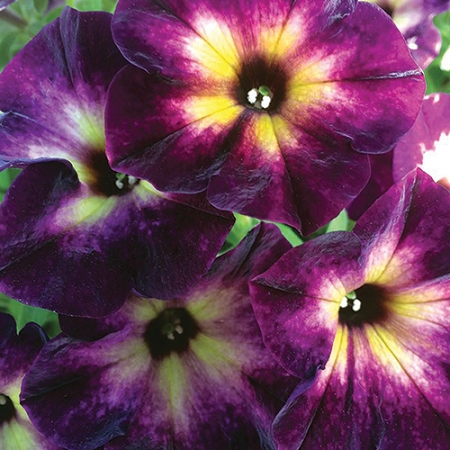 Nepřehlédnutelná dvoubarevná petúnie s krásnými tmavě fialovými květy se žlutým středem.