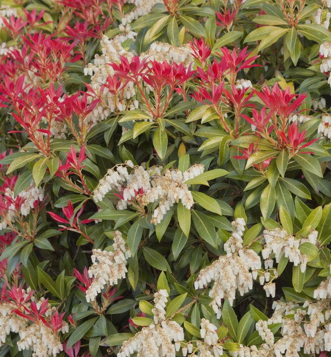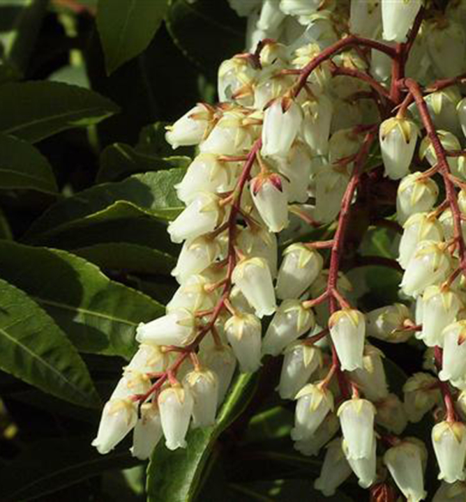 Nádherný pieris "Horský oheň" s bílými střapci zvonkovitých květů.