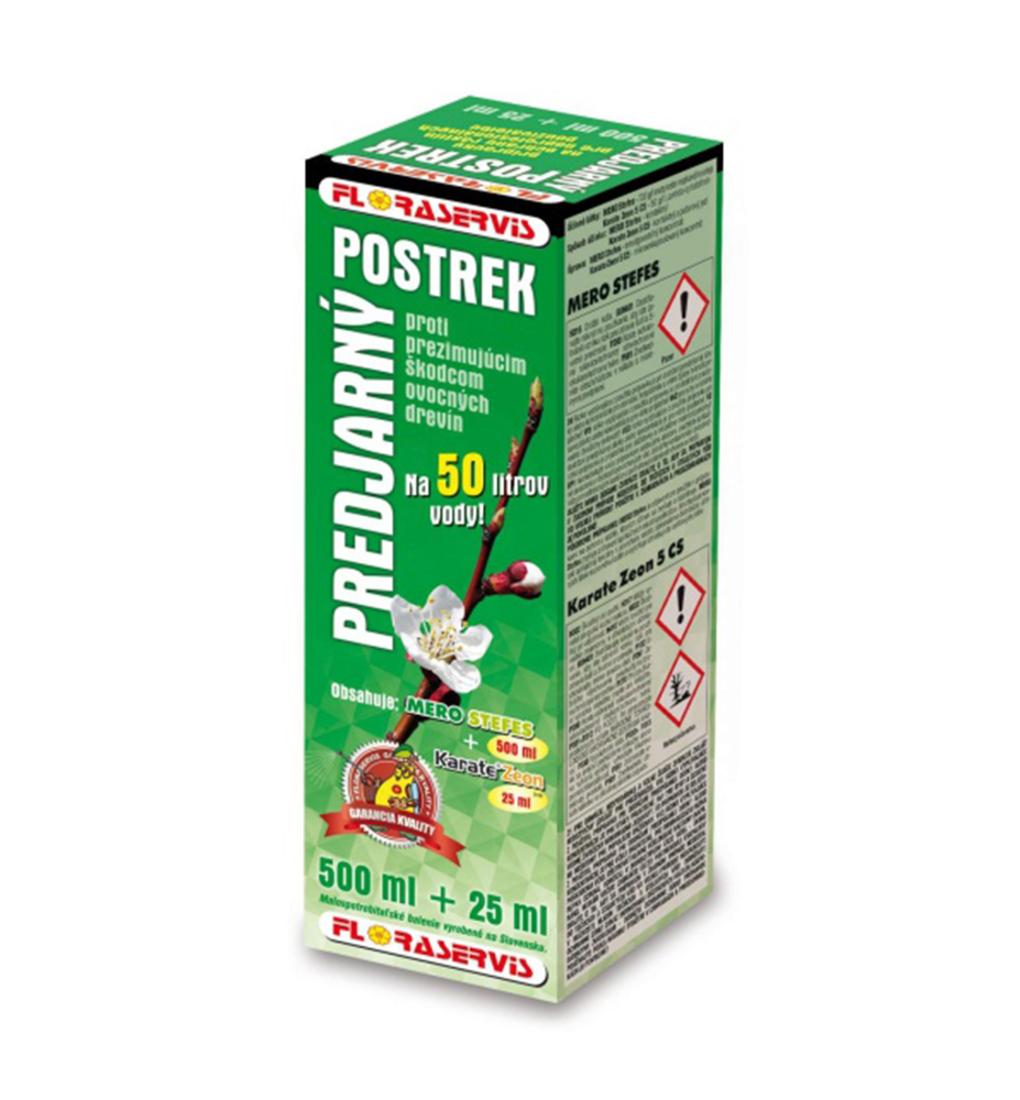Charakteristika: Kombinace přípravků Mero Stefes a Karate Zeon 5 CS určená na předjarní ošetření ovocných a okrasných dřevin (stromy, keře ....) proti přezimujícím škůdcům. (Např. Mšice, sviluška ovocný, měřeno jabloňová, štítenky, puklice, píďalky, květopasu .....). Hubení přezimujících škůdců je důležitou součástí celoroční ochrany ovocných a okrasných dřevin, protože škůdců zasáhneme ve stadiu vajíček nebo larev, tedy ještě dříve, než způsobí větší škody. Insekticidní složka ničí škůdců přímo jako dotykový a dýchací jed, olej zase vytváří na povrchu ošetřených dřevin souvislý film, který brání vajíčkům a larvám v dýchání a hynou. Čím je teplejší, tím jednotlivé stadia škůdců intenzivněji dýchají a o to výrazněji se projeví ničivý účinek insekticidu s olejem. Proto by se teplota při předjarním postřiku měla pohybovat nad 15 ° C. Předjarní postřik má být vydatný a důkladný, proto bychom ho měli udělat za bezvětří.
