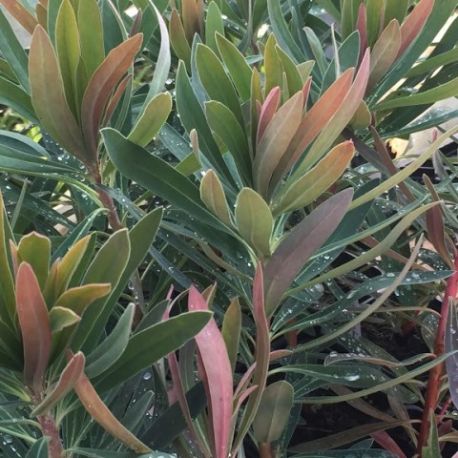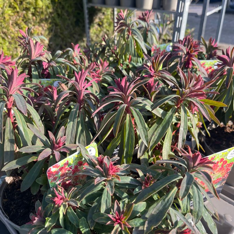 Dekorativní pryšec s úzkými zelenými listy a koralově růžovými květy.