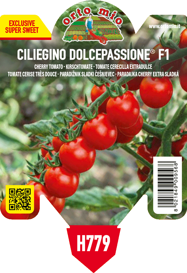 Charakteristika: ´DOLCEPASSIONE F1´ je hybridní odrůda cherry rajčata s mimořádně sladkými plody, která je ceněna především pro chuť a dobrou trvanlivost. Plody jsou středně velké s průměrnou hmotností přibližně 15-20g. Jsou vhodné k přímé konzumaci, do salátů, jako barevný doplněk jídel nebo pro snadné kuchyňské zpracování. Tato odrůda je přirozeně odolná vůči chorobám.