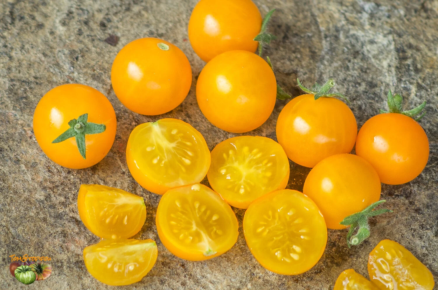 Chutná odrůda cherry rajčata se šťavnatými plody ve zlatožluté barvě.
