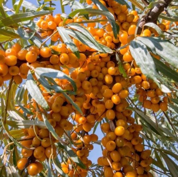 Raná, méně trnitá odrůda rakytníku s chutnými ananasovými plody.