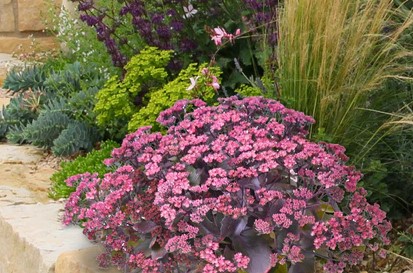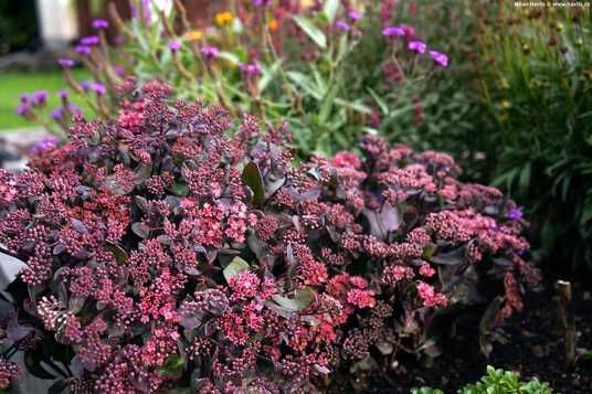 Velice pěkný nižší rozchodník s tmavými listy a růžovými květy.