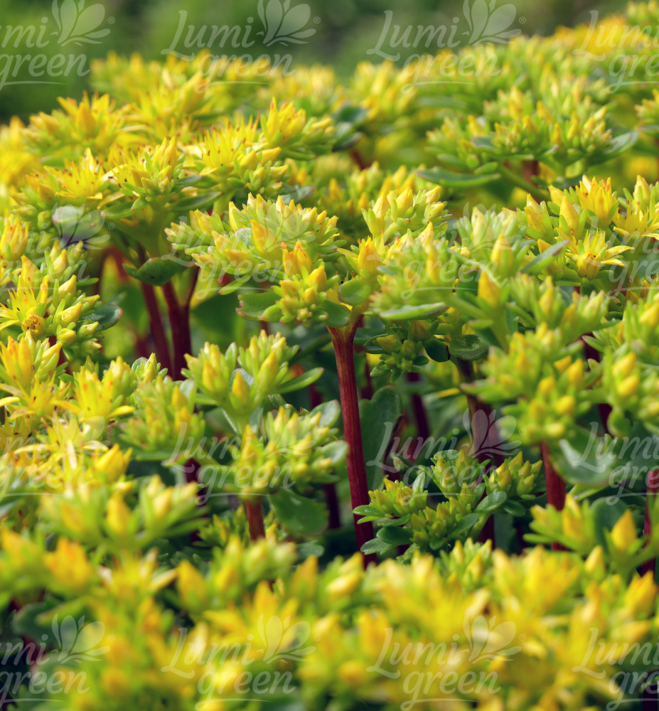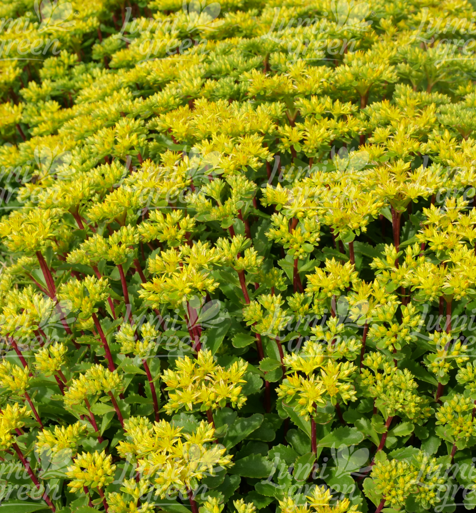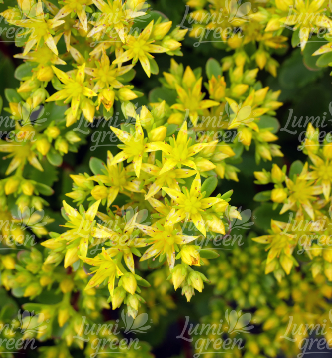 Nenáročný půdopokryvných rozchodník se zářivě žlutými hvězdicovitými květy.