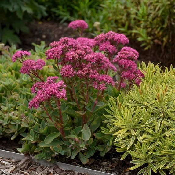 Nenáročný vyšší rozchodník s výraznými růžovo-červenými květy.