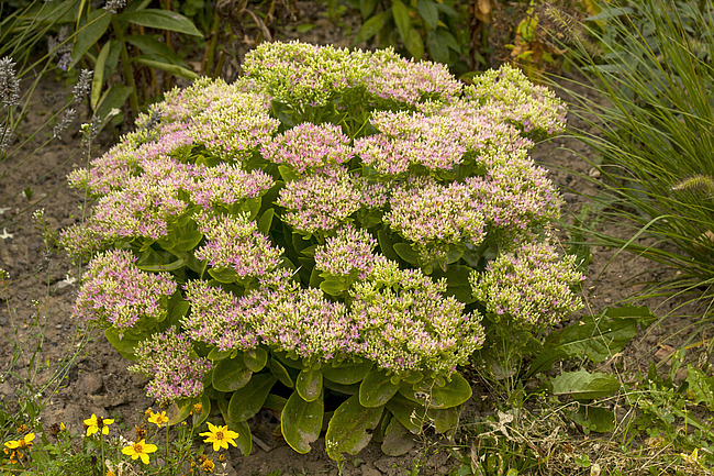 Nádherný růžovo kvetoucí rozchodník se zářivými limetkově zelenými listy.