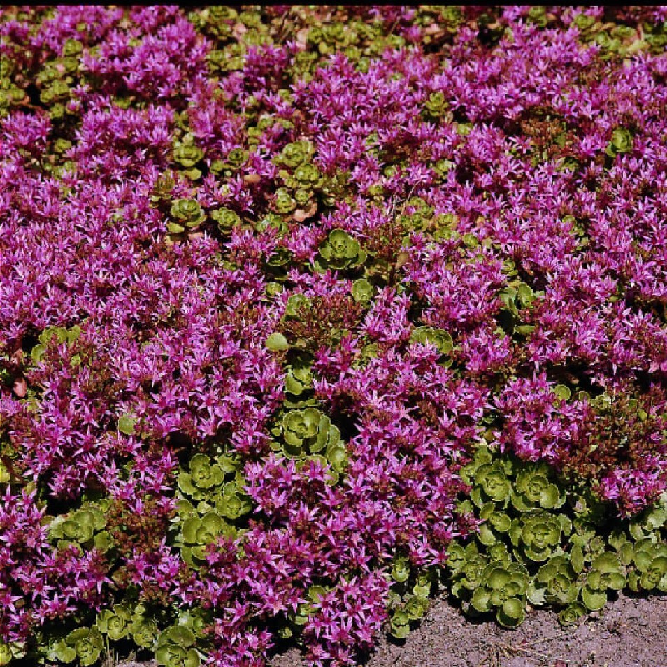 Půdopokryvná odrůda s dužnatými listy a výraznými růžově červenými květy.