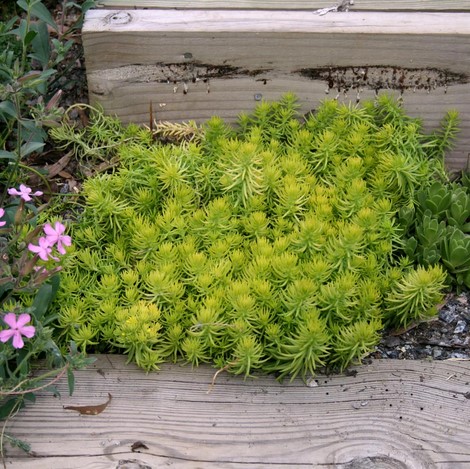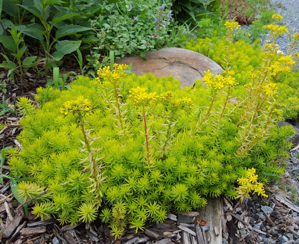 Zajímavý půdopokryvných rozchodník se žlutozelenými jehlicovitými listy.