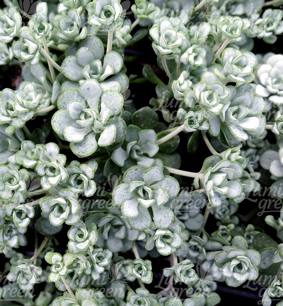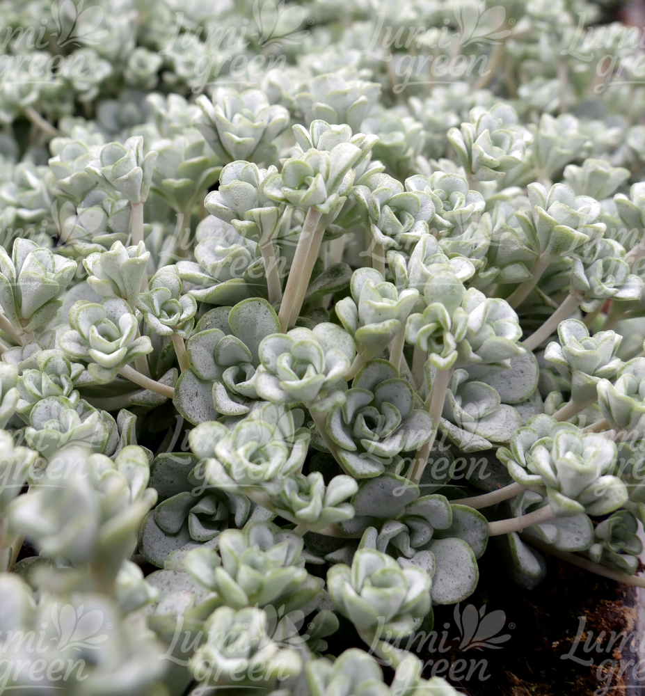 Rozchodník se stříbřitě šedými až bílými listy ve tvaru malých růžiček.