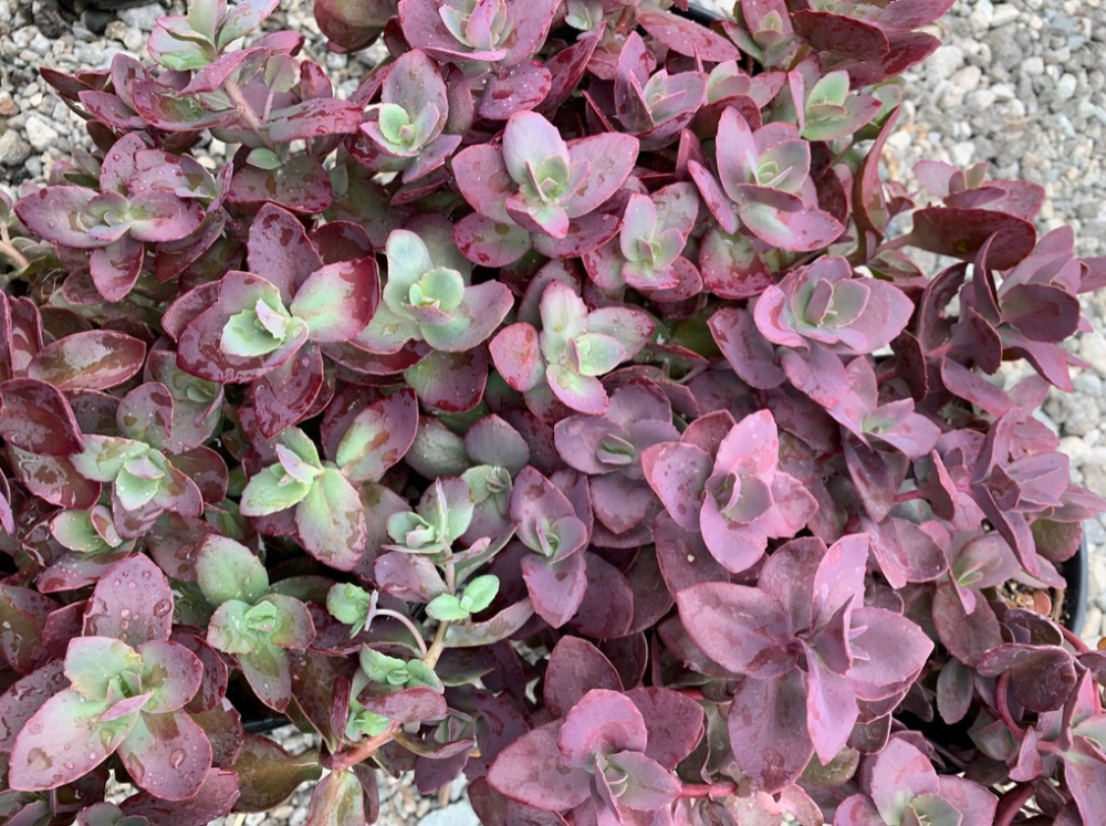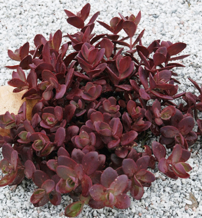 Nový nízký kompaktní tmavě červený rozchodník s výraznými růžovými květy.