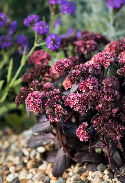 Výrazný rozchodník s purpurovými listy a třešňově červenými květy.
