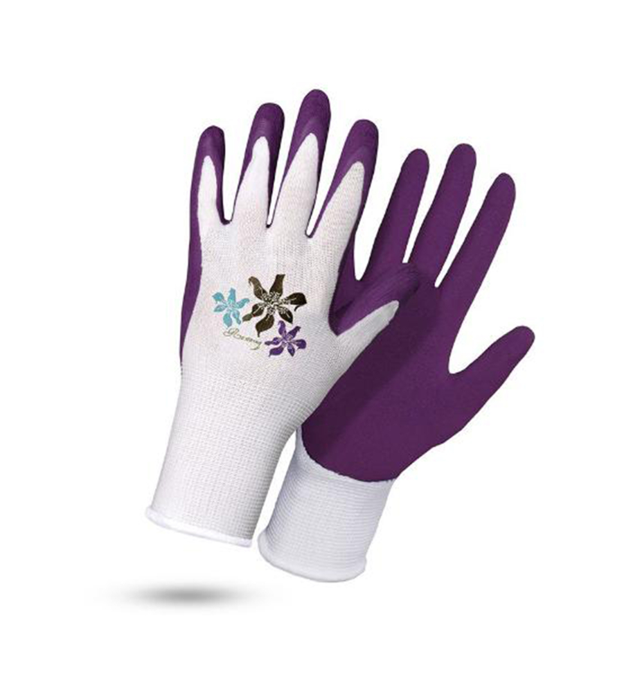 Charakteristika: Rukavice NERINE jsou velmi pohodlné díky efektu druhé kůže, který zajišťuje jemné pletení. Latexový povlak poskytuje odolnost proti vlhkosti na dlani. Fialová barva potahu a květinový znak dělají rukavici snadno viditelnou. Jsou určeny hlavně pro nenáročné práce v zahradě a v domácnosti pro úklid.