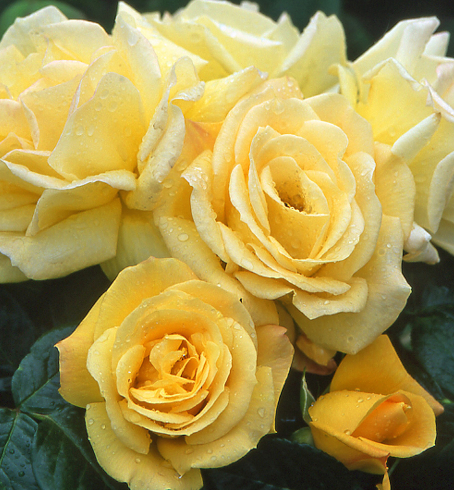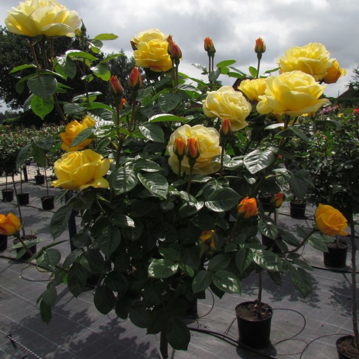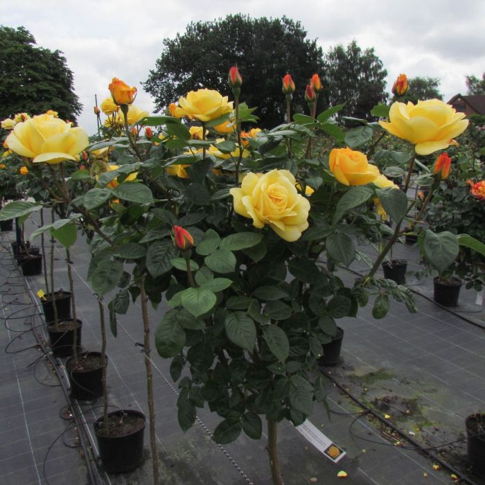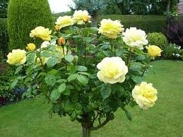 Odolná stromková růže se zlatě žlutými květy a lahodnou vůní.