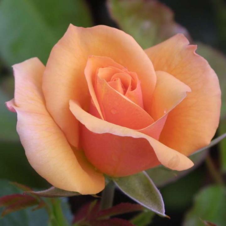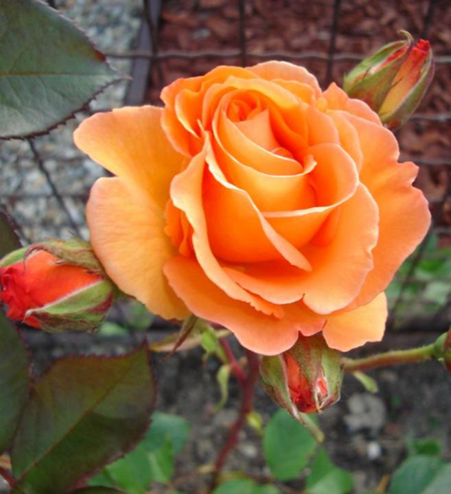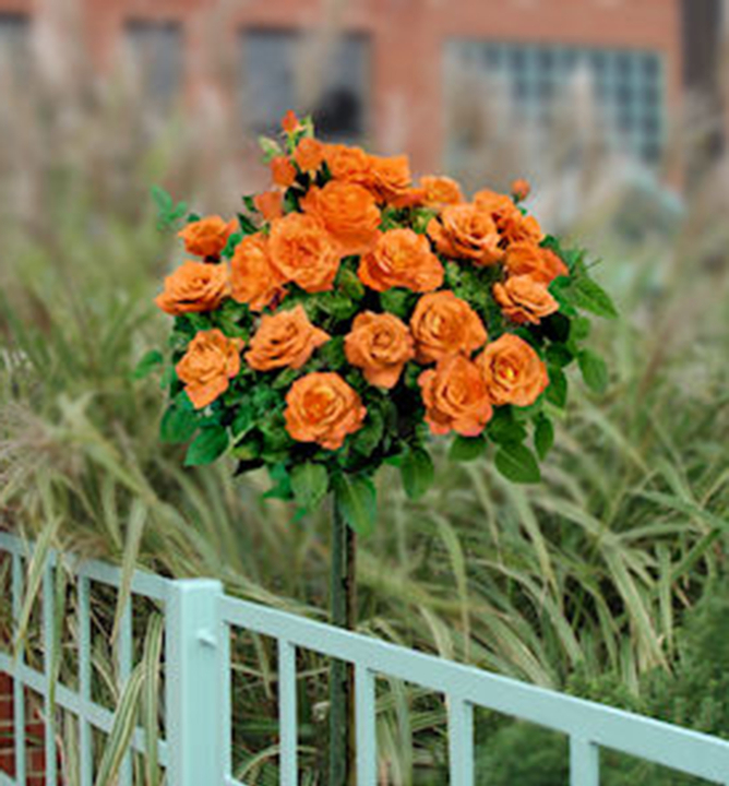 Nádherná stromková růže s netradičními ohnivě oranžovými květy.
