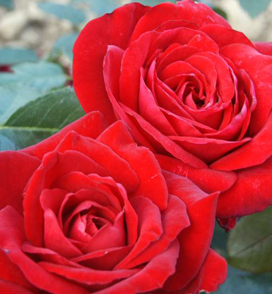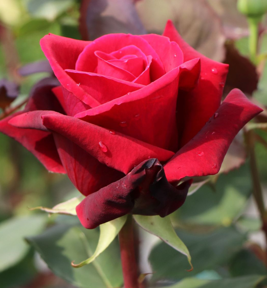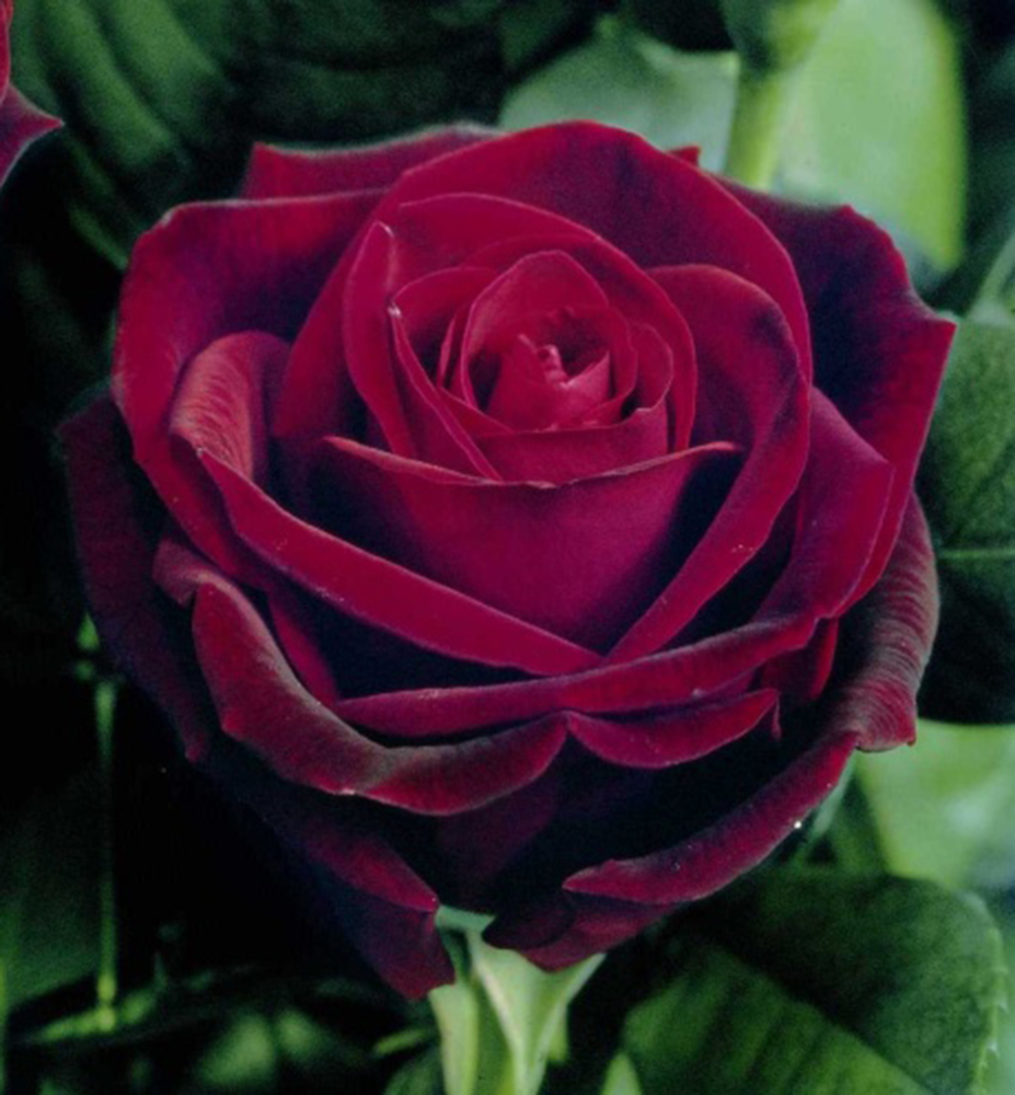Stromková růže s nádherně tvarovanými květy v sametové tmavě červené barvě.