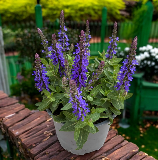 Kompaktní okrasná šalvěj s výraznými modro-fialovými květy, vhodná pro pěstování v květináči.