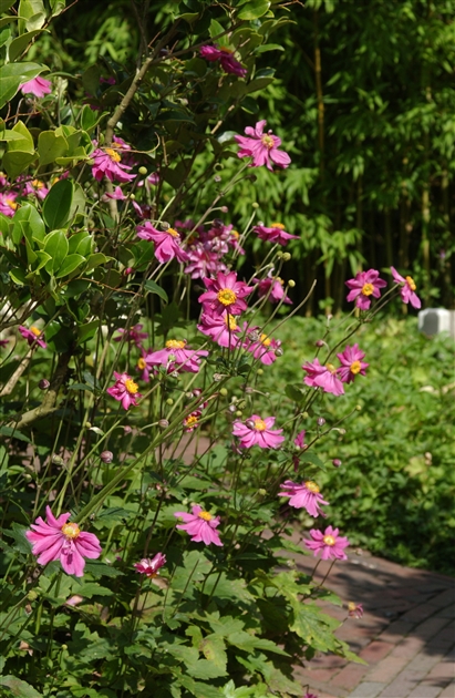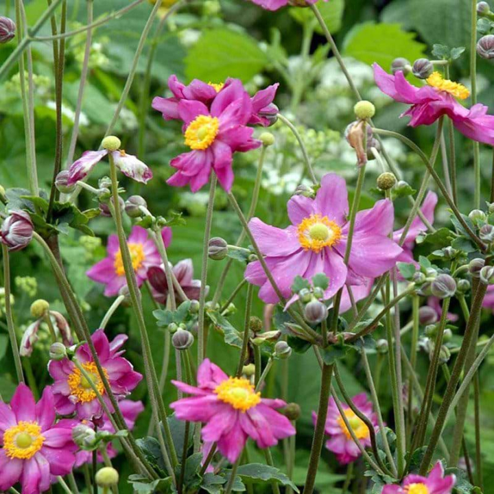 Bohatě kvetoucí podzimní sasanka s elegantními sytě růžovými květy.