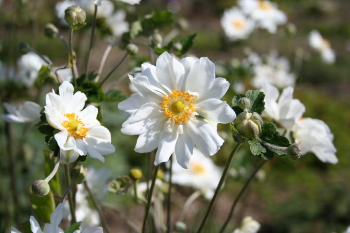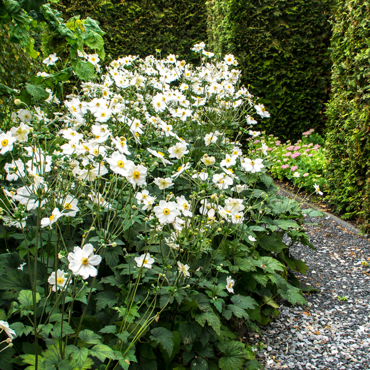 Oblíbená poloplná podzimní sasanka s romantickými sněhobílými květy.
