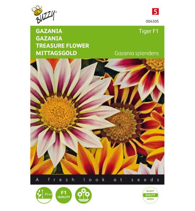 Charakteristika: Semena gazanie 'TIGER' nabízejí mix pruhovaných květů rozmanitých barev. Gazánie tvoří růžici přízemních listů, které mají kopinatý tvar a ze spodní strany jsou pokryty bělavou plstí. Krátké stonky nesou výrazně zbarvené květy, které jsou poměrně velké (až 12 cm) a jsou velmi dekorativní. Rostlina dorůstá 25 cm.